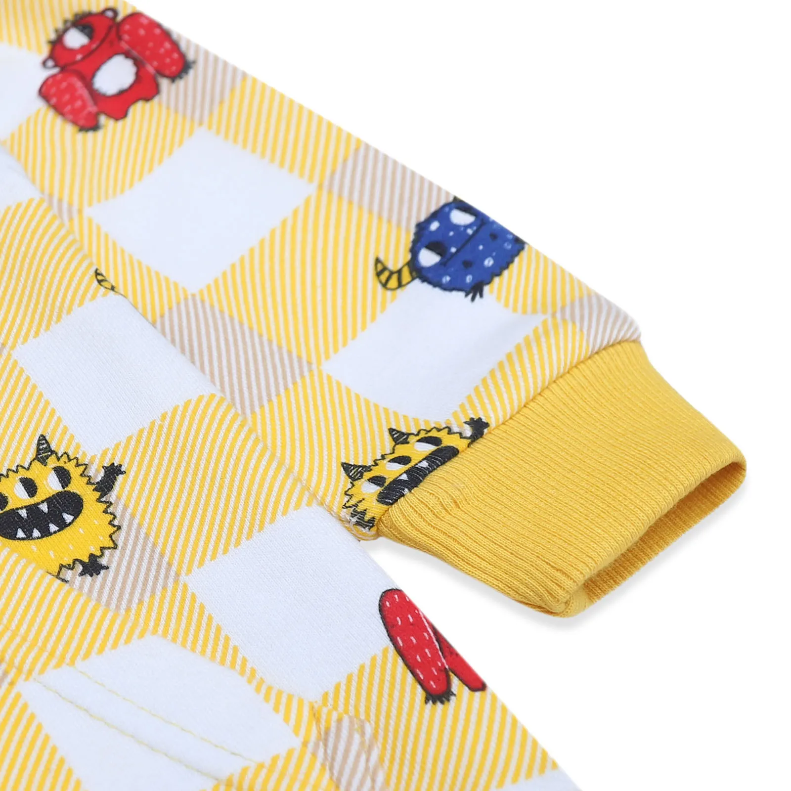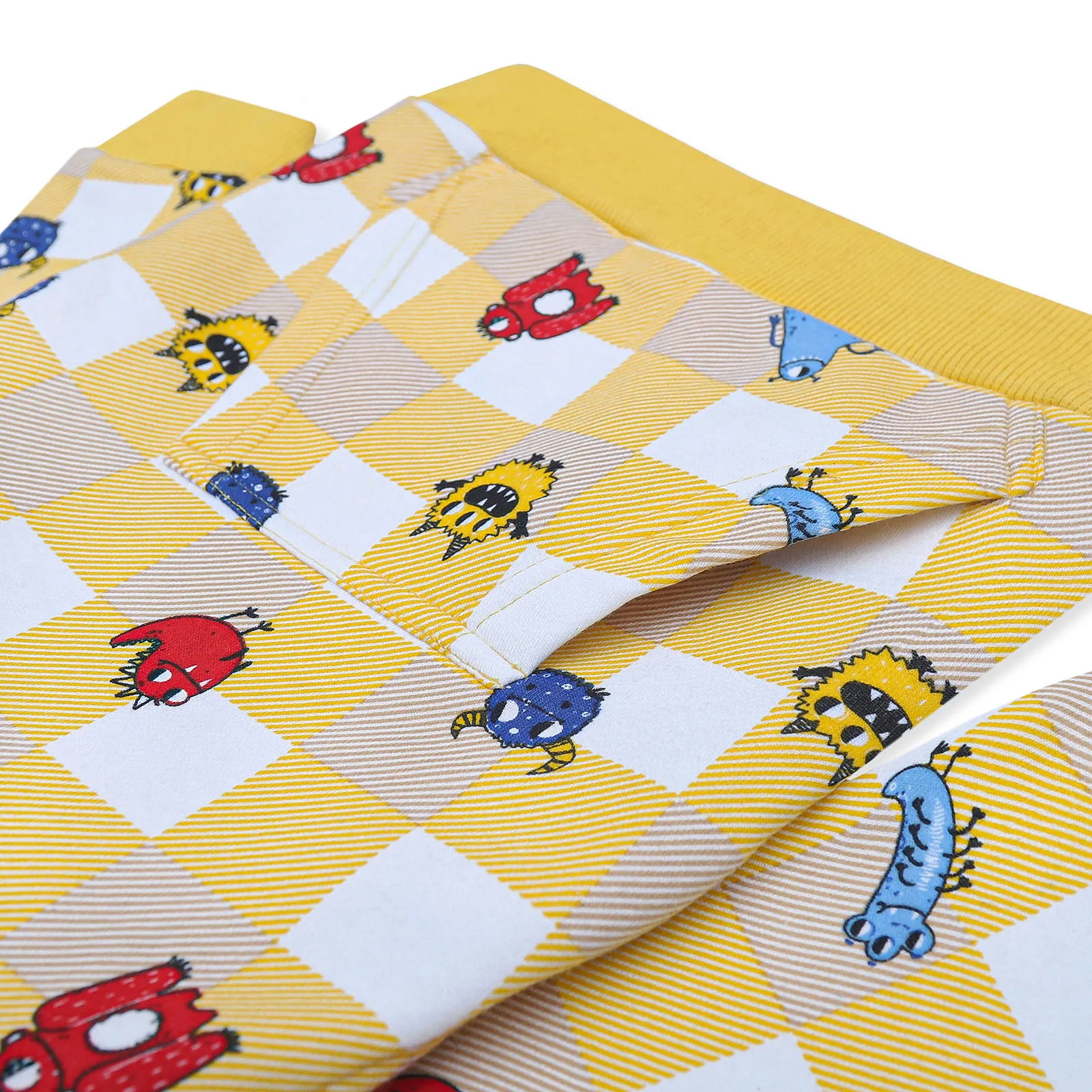 Add a playful twist to his wardrobe with this yellow checkered hoodie, featuring vibrant and quirky monster prints. The cozy kangaroo pocket and soft fleece lining provide warmth and style, making it perfect for cooler days. Designed for comfort and fun, this hoodie is a must-have for every little adventurer!