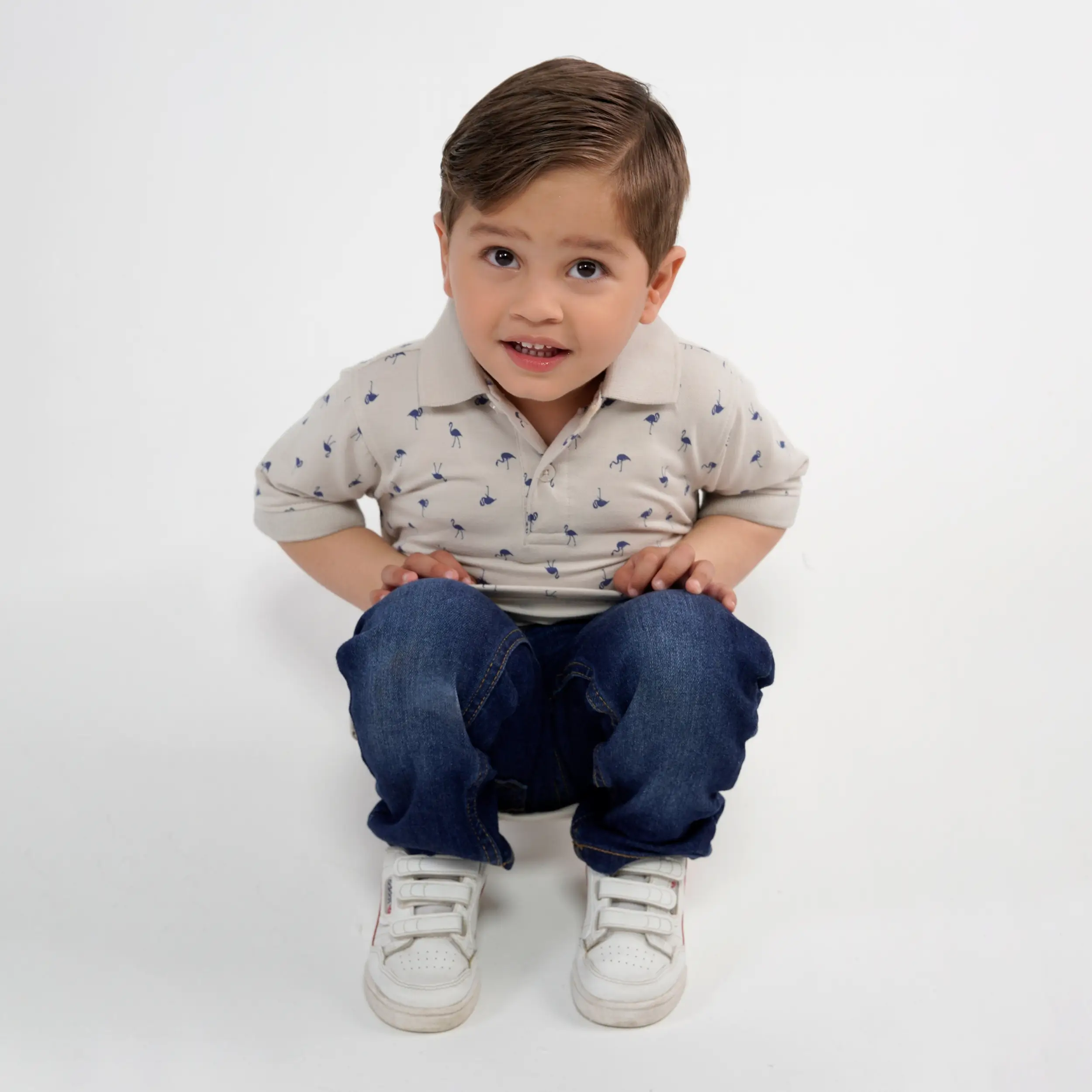 Subtle base, standout print. Thisn polo comes in a muted stone tone, lifted by an all-over print of graceful blue flamingos. Smart yet spirited, it’s a fun twist on a classic silhouette—perfect for little trendsetters who like to keep it cool.